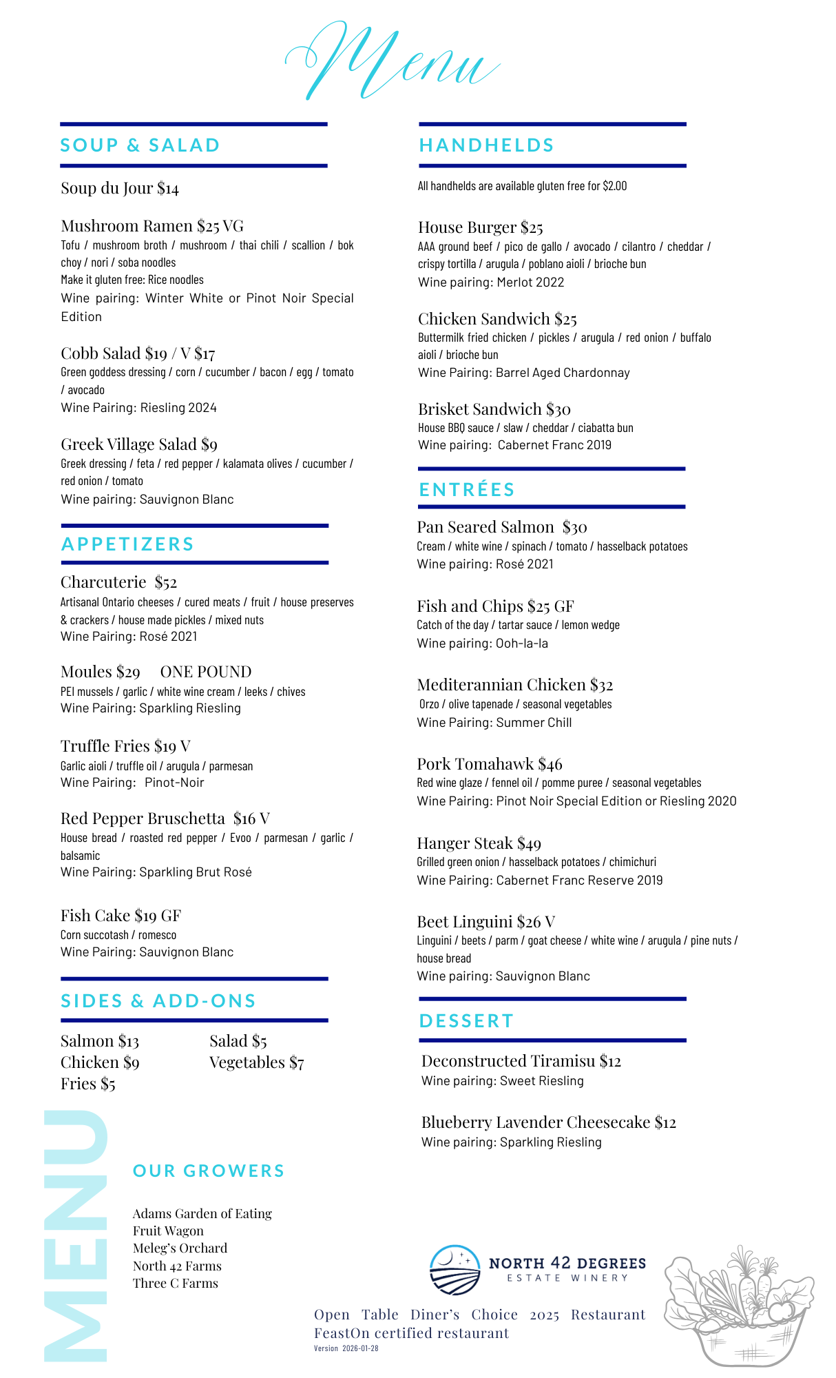 The suggested wine pairings have been thoughtfully chosen by our sommelier, Leslie to compliment each dish and for you to tantalize your senses with our award winning wines.